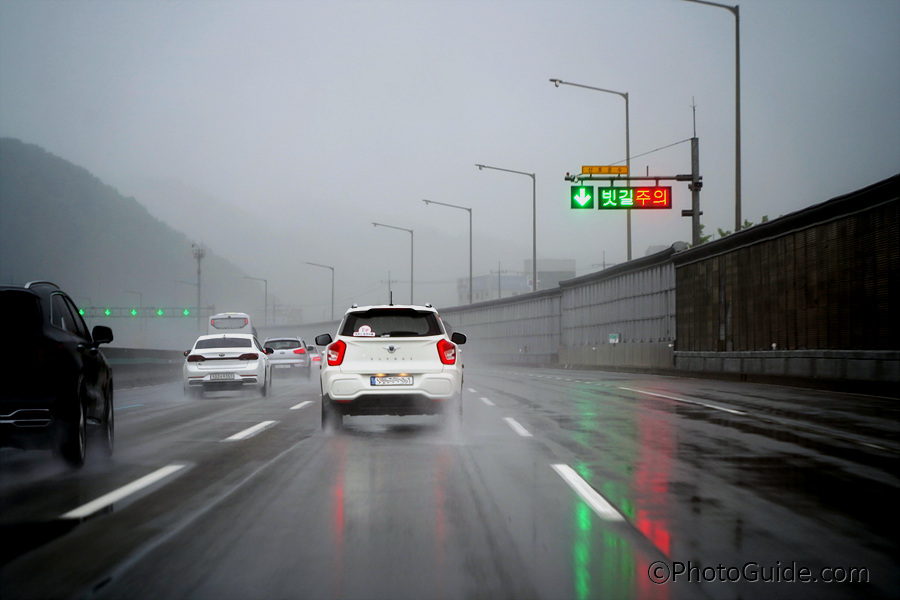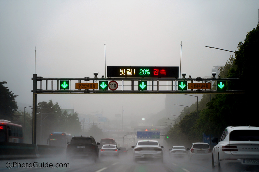 빗길에서는 감속하라는 안내판, 운전할 때만 그런 것이 아니라 인생도 그러합니다.