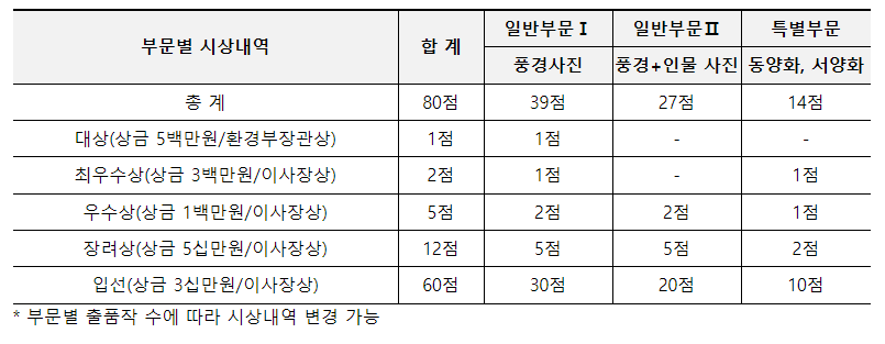 2023년 국립공원 공모전은 총 80점 작품을 선정해 환경부 장관상과 국립공원공단 이사장상을 부상으로 수여하는 등 총 4천만원의 상금이 주어집니다. 상금 규모가 다른 사진공모전에 비해 제법 됩니다. 이번 국립공원 사진공모전에서는 기존 국립공원 자연 생태계, 역사·문화 자원 등 경관사진 외에도 자연과 사람이 공존하는 모습을 담은 ‘자연과 사람이 공존하는 사진 분야’를 추가로 공모합니다. 한편 특별부문으로 지난해에 이어 동양화 외 서양화를 새로 추가됐습니다.
