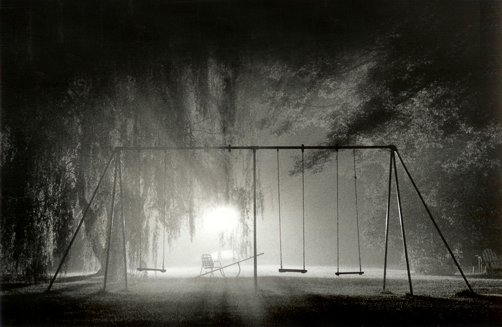 "야간 사진과 관련된 많은 특징들이 매력적입니다. 우리는 태양이라는 단일 광원을 다루는 것에 익숙합니다. 그래서 다양한 방향에서 오는 여러 개의 빛은 매우 초현실적이고 연극적일 수 있습니다. 드라마는 대개 인공 조명에 의한 깊은 그림자와 함께 증가된다. 이 그림자들은 우리가 무엇이 숨겨져 있는지 상상하도록 우리를 초대할 수 있다. 저는 특히 오랜 노출로 인해 일어나는 일을 좋아합니다. 예를 들어, 움직이는 구름은 하늘에서 흥미로운 밀도의 독특한 영역을 형성하고, 별과 비행기는 하얀 선을 생성하며, 거친 물은 얼음이나 안개로 변환됩니다. 필름은 빛을 축적하고 우리의 눈이 볼 수 없는 사건들을 기록할 수 있다. 야간 피폭에 내재된 예측 불가능성의 측면도 사전 예방에 좋은 해독제가 될 수 있다. 시차 적응에도 도움이 된다고 생각해요! 1977년 뉴욕 주 북부에 있는 그네들로 만들어진 제 첫 번째 밤 사진은 잠을 잘 수 없는 직접적인 결과였습니다. 그 당시에 저는 많은 괄호를 사용하여 노출 측정의 "경험적 방법(즉 시행착오)"을 사용했습니다. 결과는 매우 흥미로웠고 그 이후로 나는 내 기술을 조금 연구했다."