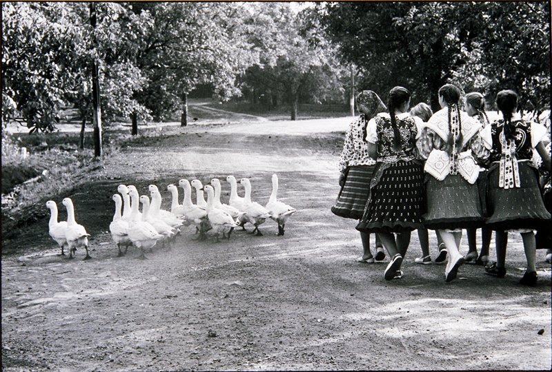 1964년 헝가리에서 촬영된 거위의 무리와 일군의 젊은 여성들 사진은 우연적인 요소를 가미한 프레임 속에서의 융합이 가져다 주는 해학성이 엿 보인다. 이 사진은 대비와 반복을 통해 유머를 자아낸다. 그에게 있어 사진은 삶에 대해 있는 그대로의 조망과 재미 그리고 유머를 보여주는 통로였다.