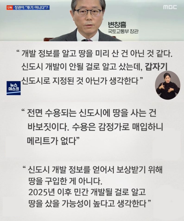 5일 MBC의 보도에 따르면 변 장관은 "개발 정보를 알고 땅을 미리 산 건 아닌 것 같다"며 "전면 수용되는 신도시에 땅을 사는 건 바보짓이고 수용은 감정가로 매입하니 메리트가 없다"고 했다. 이는 이제까지 국토부가 주택 공급 대책을 발표하면서, 소유주에게 손해되지 않는 방향으로 토지 수용을 하겠다고 말한 입장과는 상반된 내용이기도 하다.