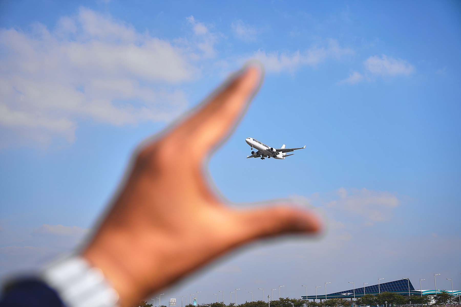 비행기가 날아가는 모습을 그냥 찍어보려다 너무 밋밋해서 손안에 잡히는듯한 착시 현상의 사진을 연출했습니다.