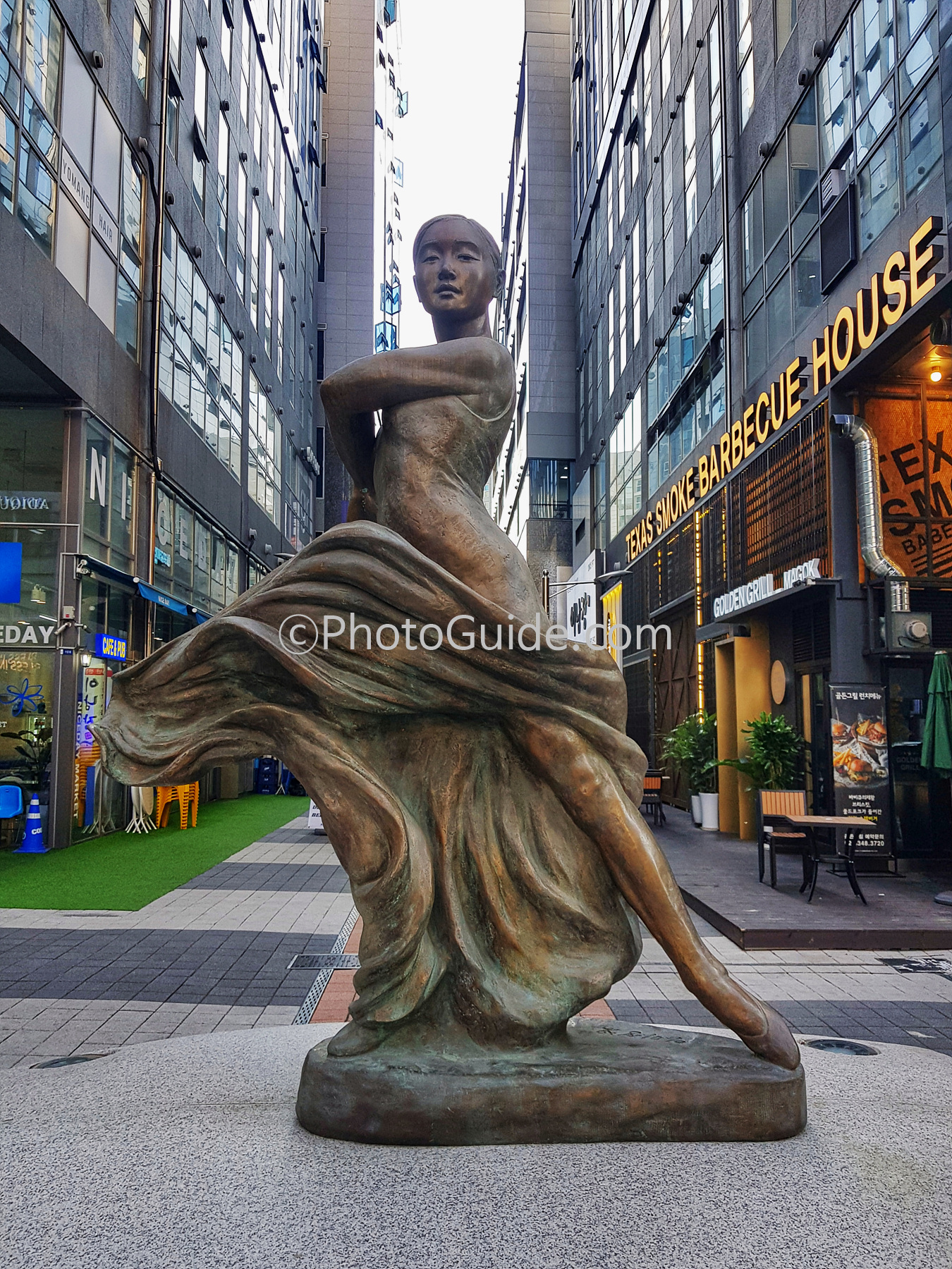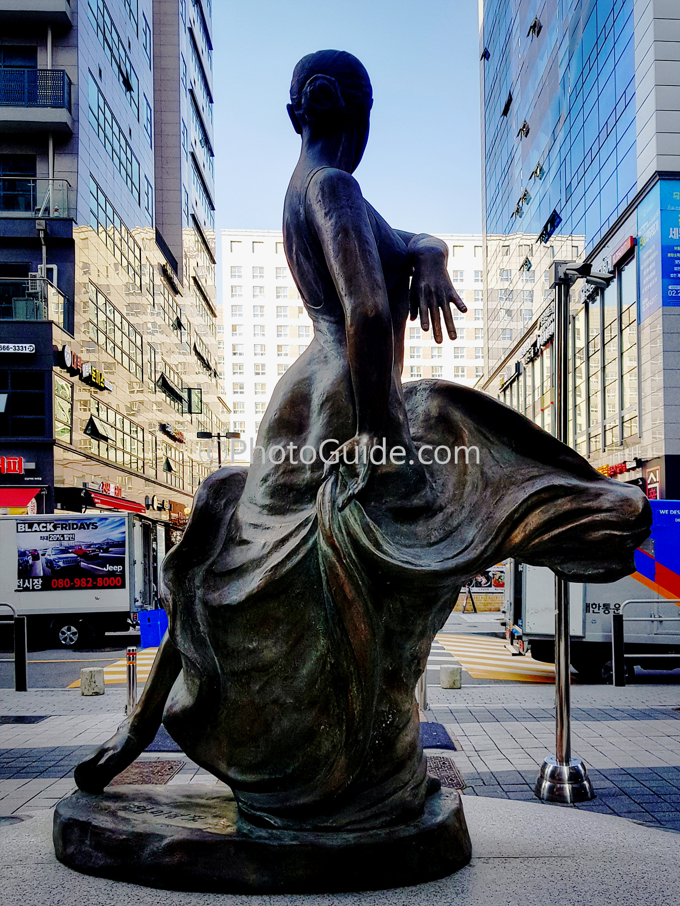 플라멩코를 춤추는 여인이 빌딩과 빌딩 사이의 열린 하늘을 보는 모습으로 이 조각상이 절묘한 위치에 있음을 알 수 있습니다. 공공예술작품은 어디에 설치하느냐는 공간적 차원의 배려도 무척 중요한데 이 조각상은 위치 선정도 잘되어 있습니다.