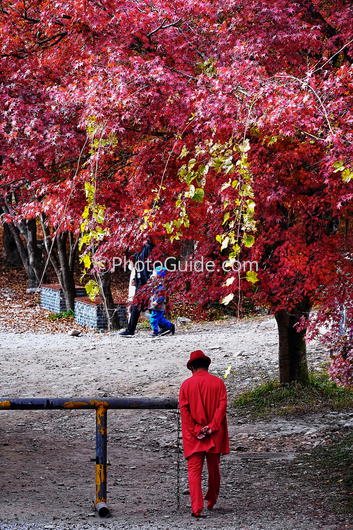 그런데 어느 단풍나무 밑을 레드 정장을 한 남자가 서성입니다.