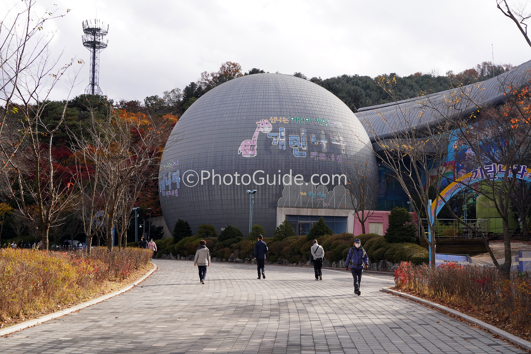 우측으로 조금만 걸어가면 원형돔의 건물이 보이고 리프트 타는 곳으로 부터 많은 우산풍경이 보입니다.