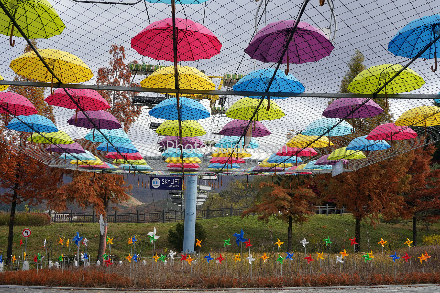 우측으로 조금만 걸어가면 원형돔의 건물이 보이고 리프트 타는 곳으로 부터 많은 우산풍경이 보입니다.