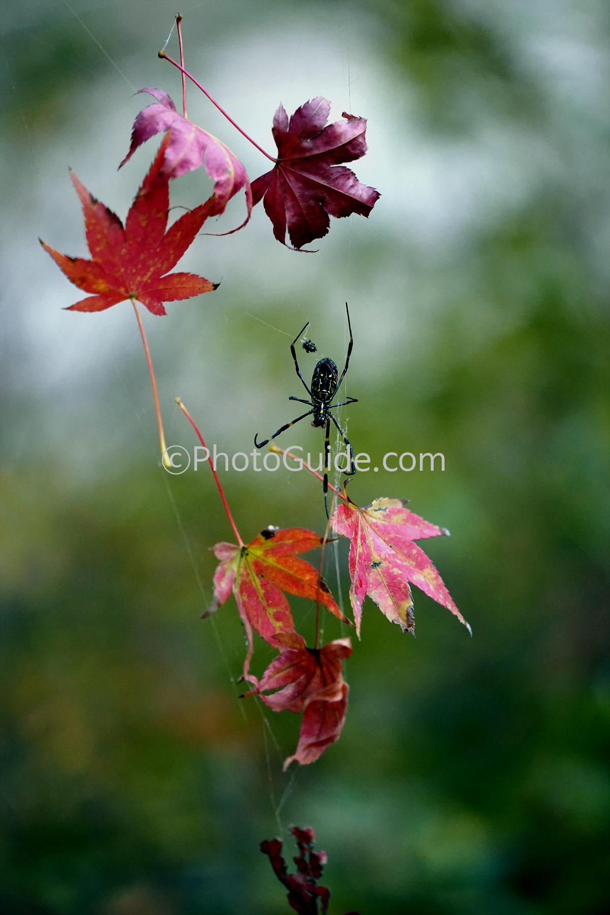 자신이 쳐 놓은 거미줄에는 잠자리나 곤충이 아니라 단풍잎만 무성합니다.