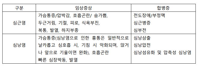 심근염의 증상은 가슴통증, 압박감, 호흡곤란, 숨가쁨, 두근거림, 기절, 피로, 식욕부진, 복통, 발열, 하지부종, 전도장애, 부정맥, 심근병증, 심부전 등 입니다.