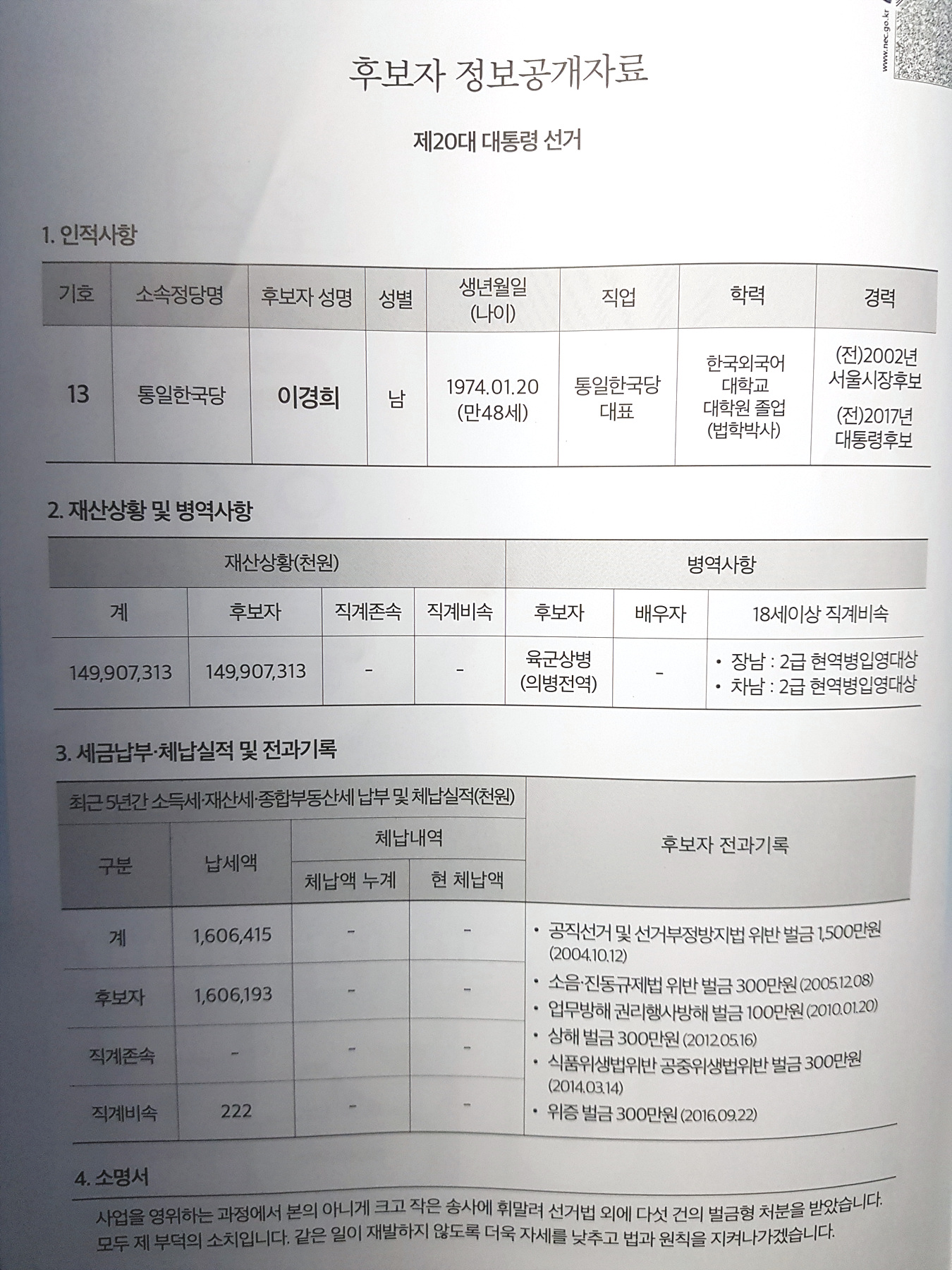 위의 전과내용은 제20대 대통령 후보로 출마하여 선전공보물에 실린 내용입니다.