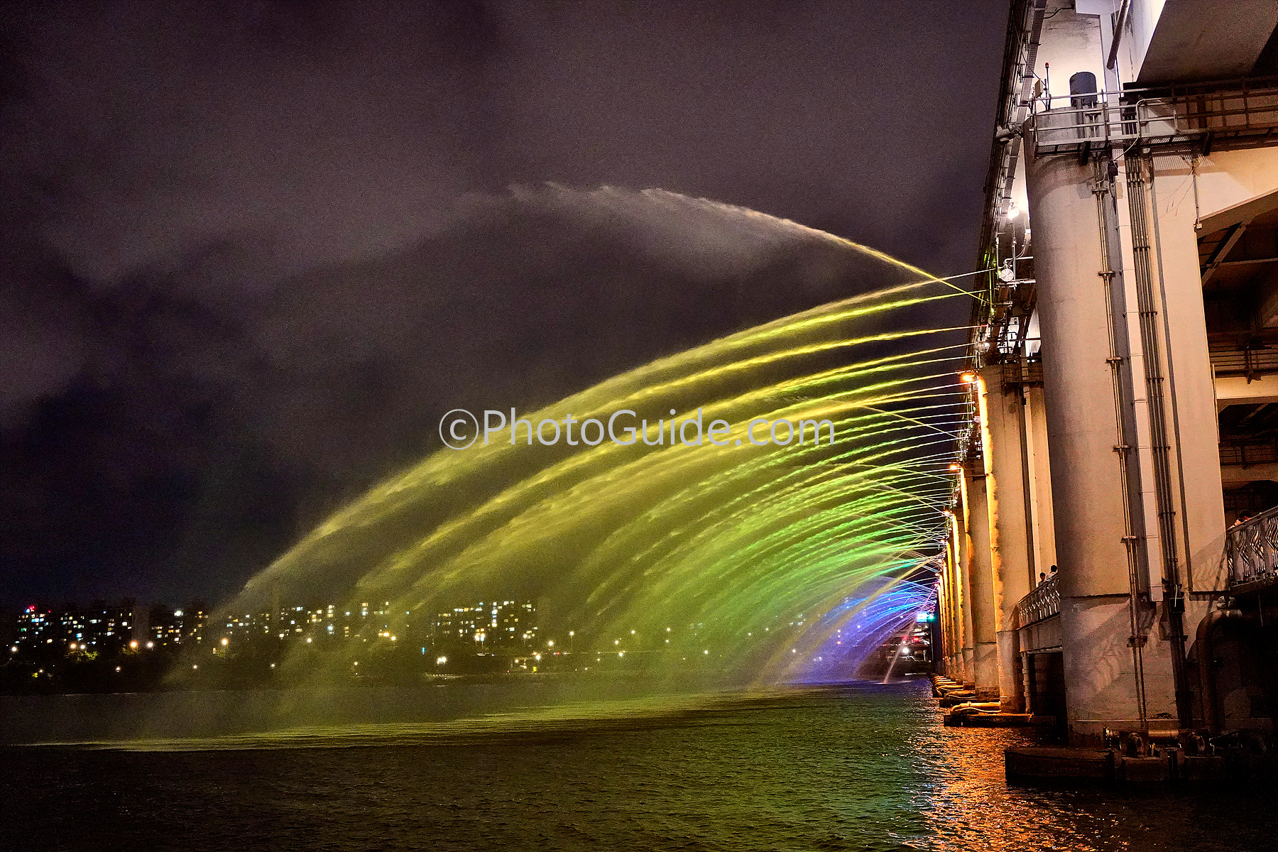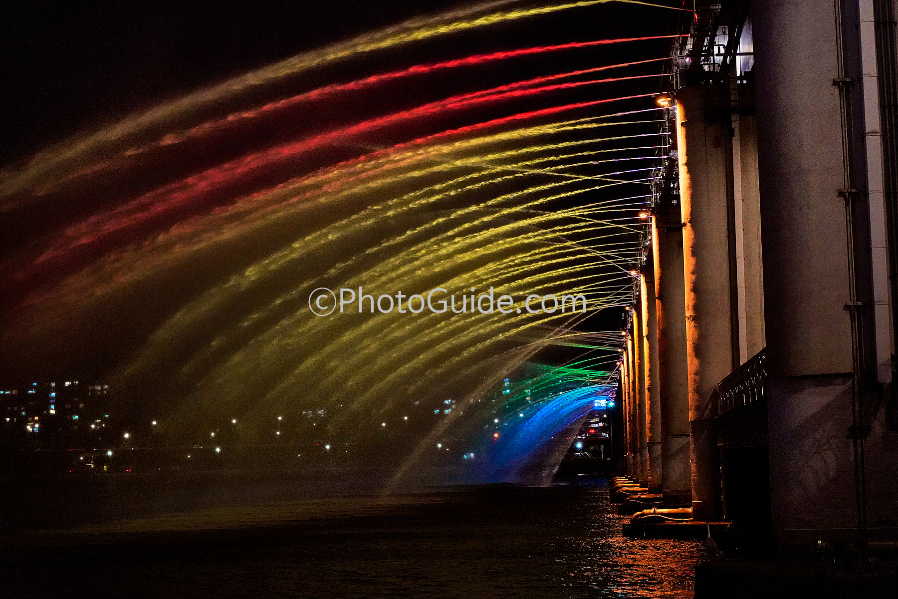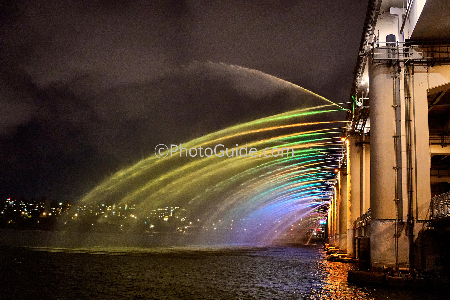 반포대교 아래에서 쏟아지는 무지개 분수의 물결을 감상하는 것도 좋지만 바로 잠수교 위로 가면 물줄길 하나 하나가 환상적인 색깔로 뿜어져 나오는 멋진 연출도 만날 수 있습니다.
