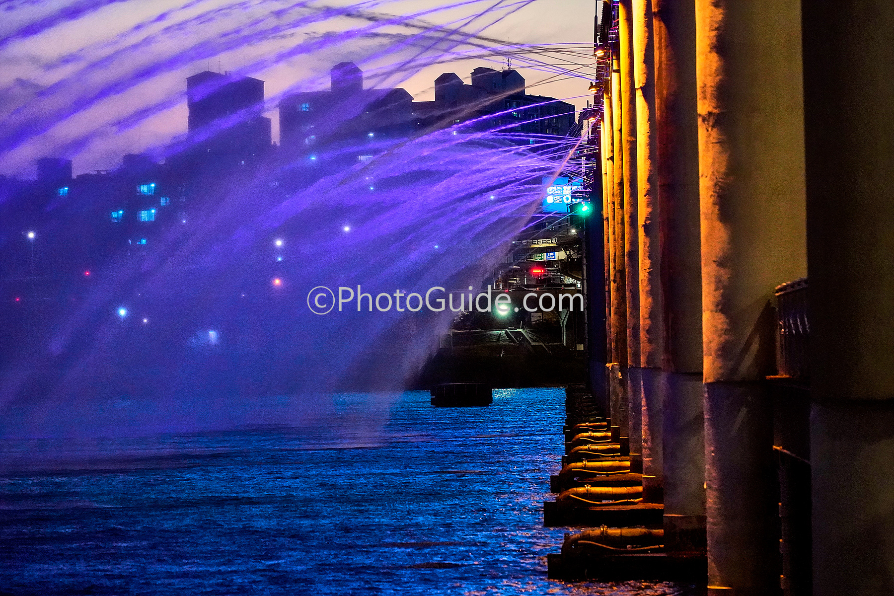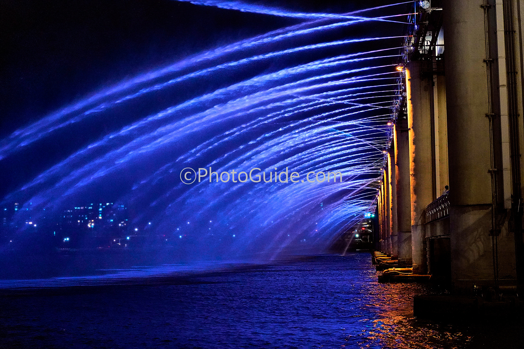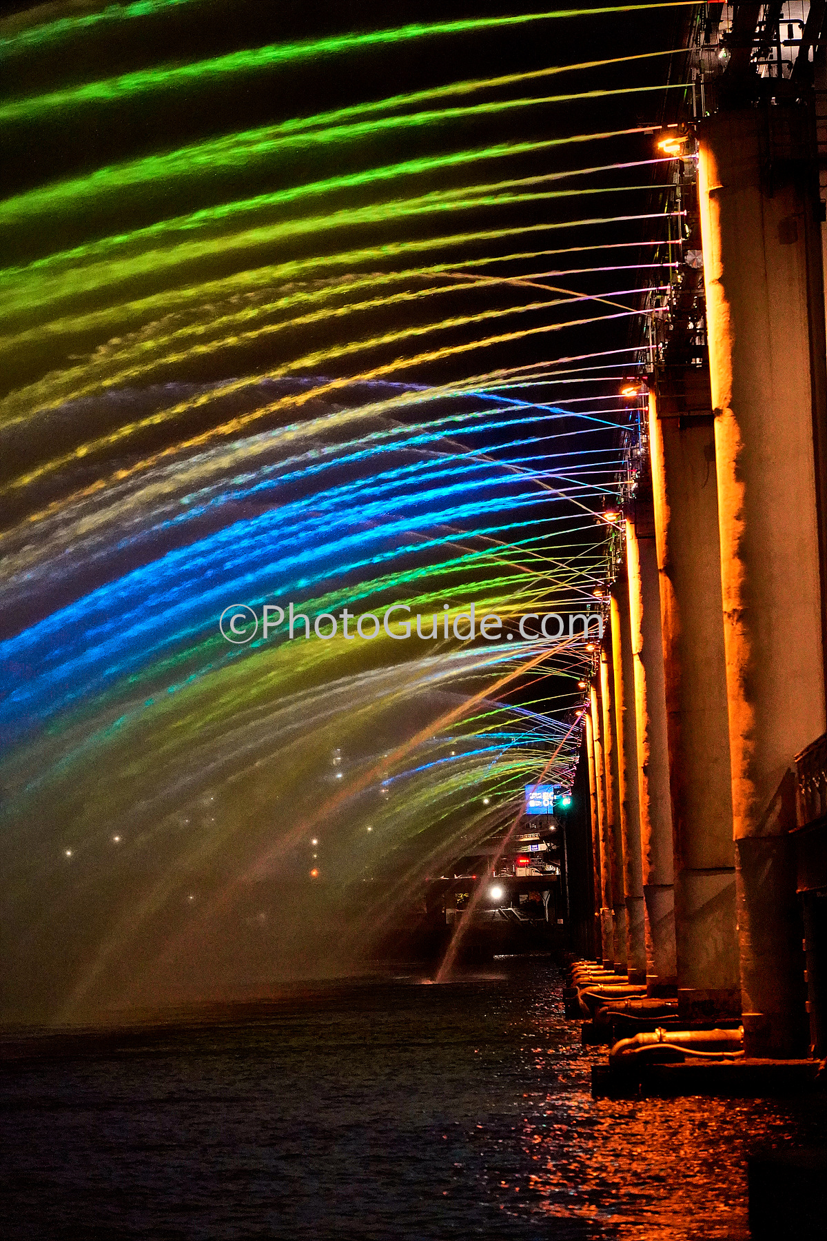 반포대교 아래에서 쏟아지는 무지개 분수의 물결을 감상하는 것도 좋지만 바로 잠수교 위로 가면 물줄길 하나 하나가 환상적인 색깔로 뿜어져 나오는 멋진 연출도 만날 수 있습니다.