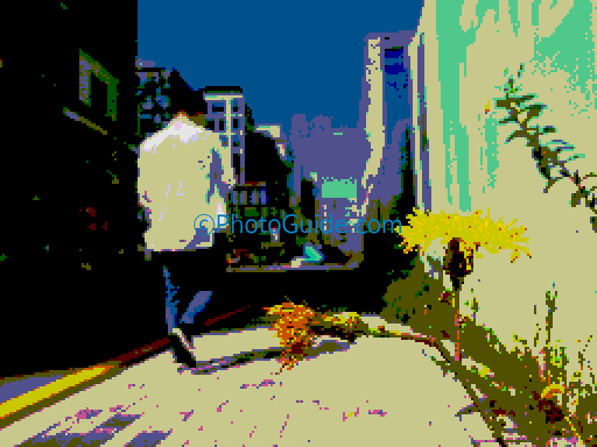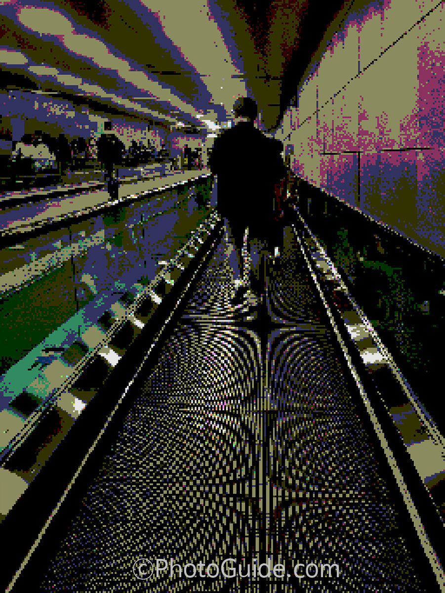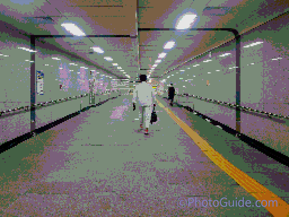도시 빌딩들 사이로 자전거를 타고 가는 사람, 지하보도를 걷는 사람, 무빙워크를 탄 사람, 거리를 걷는 사람 등 도시의 일상에서 지나다니는 현대인들의 모습을 도시와 조화시킨 픽셀아트 사진입니다.