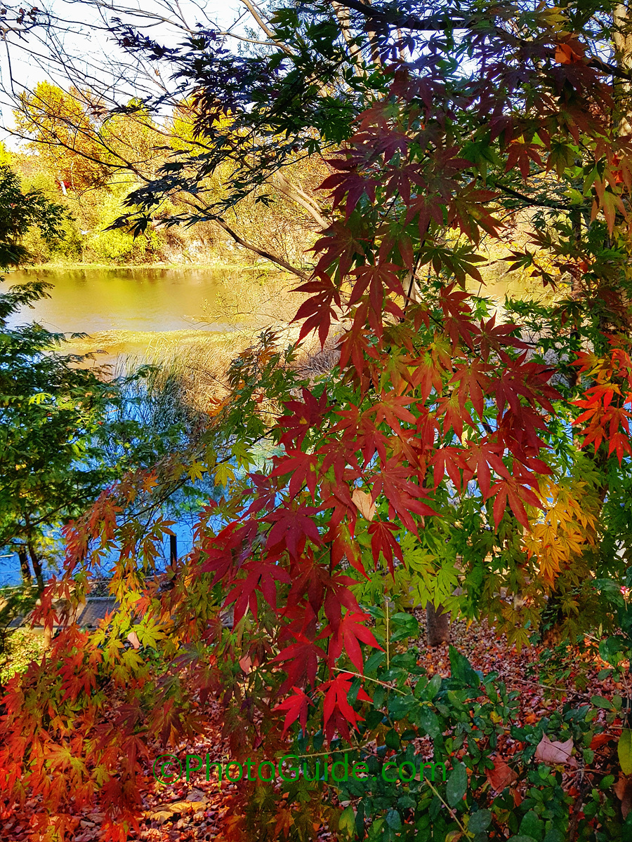 노란 은행나무, 빨간 단풍잎, 그리고 아직 단풍이 들지 못한 초록색 단풍잎 그리고 그 밑에 잔잔한 푸른 물결들이 어우러져서 가을의 색의 조합을 아름답게 보여줍니다.