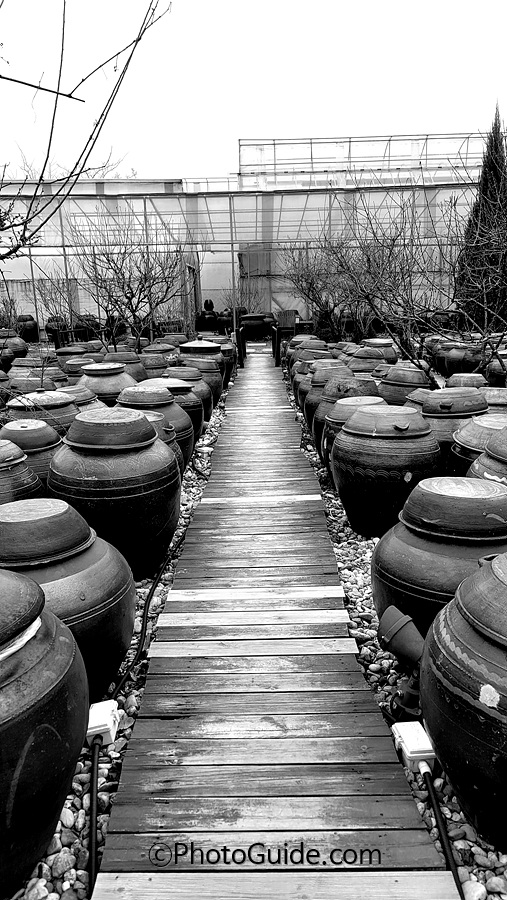 수많은 항아리들을 보니 친환경 식품을 만드는 과정이 그대로 여기에 담겨 있는듯 합니다. 항아리들도 무척 오래된 것 같이 보입니다. 항아리 모양도 각기 다른 모습이라서 이곳을 지나가면서 항아리 감상하는 것도 재미있습니다. 여기에는 고추장, 된장 등이 숙성의 시간을 보내는 것 같습니다. 그런데 정말 이렇게 항아리들이 많은 것은 처음 본 것 같습니다. 보통 야외 카페에 장식용으로 항아리 몇 개 또는 수십 개로 정원에 장식용으로 비치는 하는데, 여기 항아리는 장식용이 아니라 식용을 위한 것들입니다. 그럼에도 항아리 구경이 생각하지 않았던 진풍경이었습니다. 날이 조금 더 따뜻해지고 초록색 잎들이 무성할 때 이곳을 다시 오면 항아리의 색깔과 나뭇잎 색깔이 조화가 되어 더 멋질 것 같습니다. 아니면 겨울에 흰 눈이 가득 내렸을 때 여기 항아리 사진을 찍으면 대박일 듯합니다. 아무튼 항아리가 한 두 개가 아니고 수 천 개가 모여 있으니 장관입니다.
